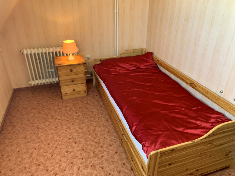 3-Zimmer-Wohnung 75 m2, im Obergeschoss. Gemütlich eingerichtet: Wohn-/Schlafzimmer mit 1 Diwanbett (140 cm, Länge 200 cm), Sat-TV (Flachbildschirm). 1 Zimmer mit 1 Doppelbett (200 cm, Länge 200 cm). 1 abgeschrägtes Zimmer mit 1 Bett (90 cm, Länge 200 cm). Grosse Küche (4 Kochplatten, Backofen, elektrische Kaffeemaschine) mit Radio. Ausgang zum Balkon. Bad/Dusche, sep. WC. Balkonmöbel, Gartengrill (mobil). Zur Verfügung: Internet (Wireless LAN, gratis). Bitte beachten: Kühlschrank ohne Gefrierfach, Nichtraucher-Unterkunft. Eigener Eingang, Rauchmelder.