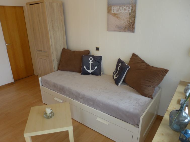 "Schwalbennest V", 1-Zimmer-Wohnung 15 m2, im Erdgeschoss. Sehr einfach eingerichtet: Wohn-/Schlafzimmer 10 m2 mit 1 Diwanbett (120 cm, Länge 190 cm), Digital-TV und Radio. Kleine Kochnische 2 m2 (2 Kochplatten, Geschirrspüler, Toaster, Wasserkocher, Mikrowelle, elektrische Kaffeemaschine). Dusche/WC. Sitzplatz. Zur Verfügung: Kinderhochstuhl (extra). Parkplatz in 20 m. Bitte beachten: Kühlschrank ohne Gefrierfach, Nichtraucher-Unterkunft. Maximal 1 kleines Haustier/Hund erlaubt. Rauchmelder. Bei dem Diwanbett handelt es sich um eine Schlafcouch im Wohnzimmer. Ein Schlafzimmer ist nicht vorhanden. Diese sehr kleine Wohnung ist für ältere und gehbehinderte Personen nicht geeignet.