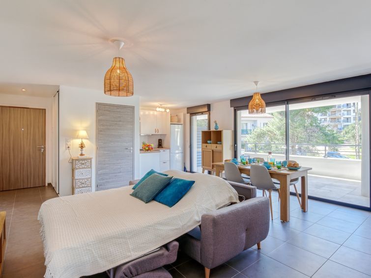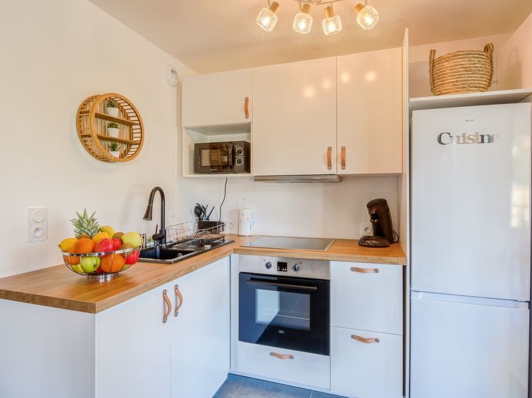 2-Zimmer-Wohnung 51 m2 im 1. Stock. Sehr schön und modern eingerichtet: Wohn-/Esszimmer mit 1 Doppeldiwanbett (140 cm, Länge 190 cm), TV (Flachbildschirm). Ausgang zur Terrasse. 1 Zimmer mit 1 franz. Bett (140 cm, Länge 190 cm). Ausgang zur Terrasse. Offene Küche (Backofen, 4 Glaskeramikplatten, Toaster, Wasserkocher, Mikrowelle, Tiefkühler, elektrische Kaffeemaschine). Ausgang zur Terrasse. Dusche/WC. E-Heizung, Klimaanlage. Terrasse 21 m2. Terrassenmöbel, Liegestühle (2). Zur Verfügung: Waschmaschine. Internet (WLAN, extra). Parkplatz. Bitte beachten: Nichtraucher-Unterkunft. Rauchmelder. 2A247001463D5