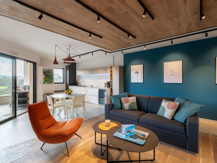 3-Zimmer-Wohnung 72 m2 im 5. Stock. Sehr schön und modern eingerichtet: Wohn-/Esszimmer mit 1 Doppeldiwanbett (160 cm, Länge 200 cm), TV (Flachbildschirm). Ausgang zur Terrasse. 1 Zimmer mit 1 franz. Bett (160 cm, Länge 200 cm). Ausgang zur Terrasse. 1 Zimmer mit 2 Betten (90 cm, Länge 190 cm). Offene Küche (Backofen, Geschirrspüler, 4 Induktionskochplatten, Toaster, Wasserkocher, Mikrowelle, Tiefkühler, elektrische Kaffeemaschine). Dusche/WC. E-Heizung, Klimaanlage. Terrasse 25 m2. Terrassenmöbel. Schöne Sicht auf die Berge. Zur Verfügung: Waschmaschine, Wäschetrockner. Internet (WLAN, gratis). Parkplatz. Bitte beachten: geeignet für Familien. Nichtraucher-Unterkunft. Rauchmelder. 2A247000320EC