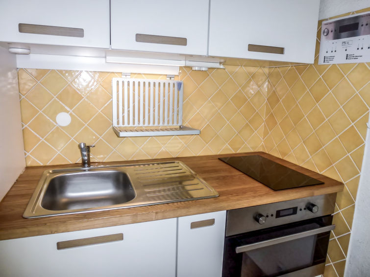 1-Zimmer-Studio 24 m2, im Erdgeschoss. Wohn-/Esszimmer mit 1 Doppeldiwanbett (130 cm, Länge 190 cm), TV. Eingang mit 1 x 2 Etagenbetten (90 cm, Länge 180 cm). Kochnische (Backofen, 2 Induktionskochplatten, Mikrowelle). Sitzbad, sep. WC. Terrasse 8 m2, Nordwestlage, Gartensitzplatz 16 m2. Terrassenmöbel. Zur Verfügung: Internet (Wireless LAN, extra). Parkplatz. Bitte beachten: Maximal 1 Haustier/Hund erlaubt. Rauchmelder. Vom Gartensitzplatz aus direkter Zugang über 3 Stufen zu den Grünanlagen der Residenz.