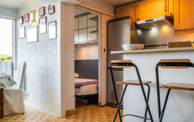 1-Zimmer-Studio 20 m2. Objekt geeignet für 2 Erwachsene + 2 Kinder. Zweckmässig eingerichtet: Wohn-/Esszimmer mit 1 Doppeldiwanbett (140 cm, Länge 190 cm), Esstisch und TV (Flachbildschirm). Kabine mit 1 franz. Bett (130 cm, Länge 190 cm). Kochnische (Mini-Backofen, Geschirrspüler, 4 Induktionskochplatten, Mikrowelle, Tiefkühler, elektrische Kaffeemaschine). Dusche/WC. Loggia. Zur Verfügung: Waschmaschine. Internet (Wireless LAN, extra). Parkplatz Nr. 611. Bitte beachten: Rauchmelder. Inserat einer Privatperson nach Artikel 155, IV, CGI.