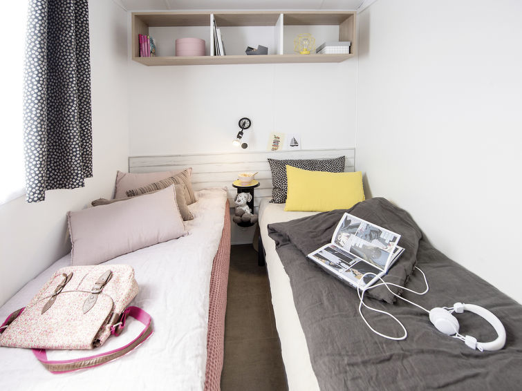 "Camping La Plage (AGL271)", 3-Zimmer-Mobilheim 28 m2. Zweckmässig eingerichtet: Wohn-/Esszimmer mit Esstisch und TV. 1 Zimmer mit 1 franz. Betten. 1 Zimmer mit 2 Betten (80 cm). Kochnische (4 Flammen, Mikrowelle, Tiefkühler, elektrische Kaffeemaschine). Dusche, sep. WC. E-Heizung, Klimaanlage. Terrasse teilweise überdacht. Terrassenmöbel. Zur Verfügung: Kinderhochstuhl, Babybett bis 2 Jahre (extra). Internet (Wireless LAN, extra). Maximal 2 Haustiere/Hunde erlaubt.