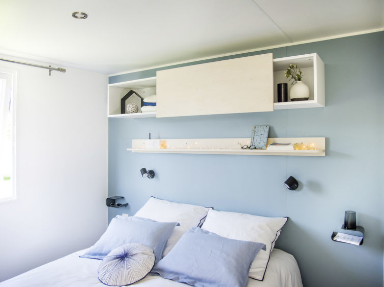 "Camping La Plage (AGL272)", 4-Zimmer-Mobilheim 32 m2. Zweckmässig eingerichtet: Wohn-/Esszimmer mit Esstisch und TV. 1 Zimmer mit 1 franz. Betten. 2 Zimmer, jedes Zimmer mit 2 Betten (80 cm). Kochnische (4 Flammen, Mikrowelle, Tiefkühler, elektrische Kaffeemaschine). Dusche, sep. WC. E-Heizung, Klimaanlage. Terrasse teilweise überdacht. Terrassenmöbel. Zur Verfügung: Kinderhochstuhl, Babybett bis 2 Jahre (extra). Internet (Wireless LAN, extra). Maximal 2 Haustiere/Hunde erlaubt.