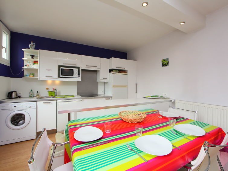 4-Zimmer-Villa 110 m2 auf 3 Stockwerken. Wohn-/Esszimmer mit TV (Flachbildschirm). Ausgang zum Garten. 1 Zimmer mit 1 Doppeldiwanbett (160 cm, Länge 200 cm). Offene Küche (Backofen, Geschirrspüler, 3 Glaskeramikherd Platten, Toaster, Wasserkocher, Mikrowelle, Tiefkühler, elektrische Kaffeemaschine) mit Durchreiche. Dusche, sep. WC. Obergeschoss: 1 Zimmer mit 2 Betten (90 cm, Länge 190 cm), Waschbecken und Dusche. Ausgang zur Terrasse. 2. Obergeschoss: 1 Zimmer mit 1 franz. Bett (2 x 80 cm, Länge 190 cm), Waschbecken und sep. WC. Terrasse 30 m2, Garten 200 m2. Terrassenmöbel. Zur Verfügung: Waschmaschine, Bügeleisen. Internet (Wireless LAN, extra). Parkplatz (eingezäunt). Bitte beachten: Nichtraucher-Haus. Rauchmelder.