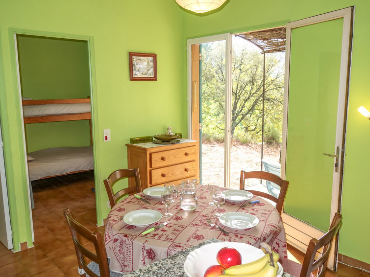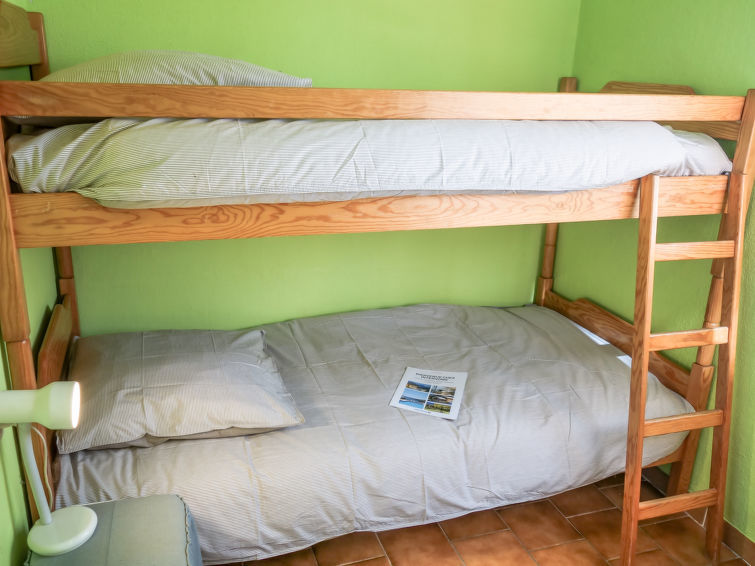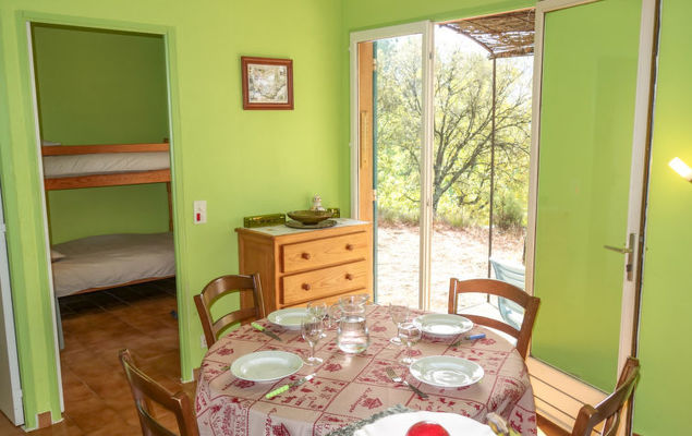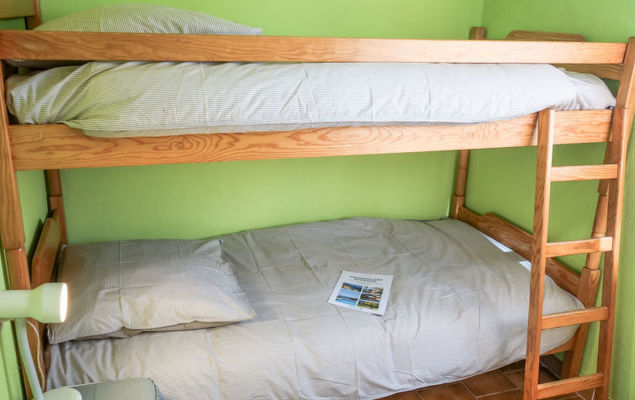 3-Zimmer-Haus 35 m2. Objekt geeignet für 2 Erwachsene + 2 Kinder. Rustikal eingerichtet: Wohn-/Esszimmer. Ausgang zur Terrasse. 1 Zimmer mit 1 franz. Bett (140 cm). 1 Zimmer mit 1 x 2 Etagenbetten (80 cm). Kochnische (2 Kochplatten, Backofen, elektrische Kaffeemaschine). Bad, sep. WC. E-Heizung. Liegestühle. Bitte beachten: 1 Haustier/Hund erlaubt. Rauchmelder.