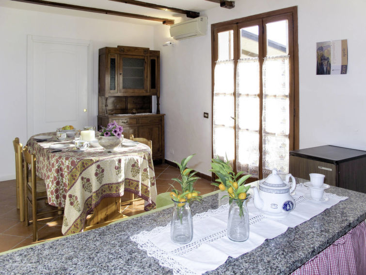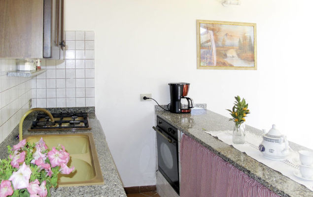 2-Zimmer-Wohnung 'Ciclamino', Erdgeschoss, ca. 40 m². Wohn-/Schlafraum mit Doppelbettcouch, Essplatz, Kamin (nur Dekoration) und durch Bartheke abgeteilte Küchenzeile (4 Flammen, Backofen, Geschirrspüler, Kühlschrank, Kaffeemaschine, Wasserkocher, Toaster), Terrassenausgang. Doppelzimmer (Bett 1,60 m breit). Dusche/WC. Klimaanlage. Vor dem Eingangsbereich überdachte Terrasse (15 m²) mit Blick bis zum Meer. CITR: 008047-AGR-0005
