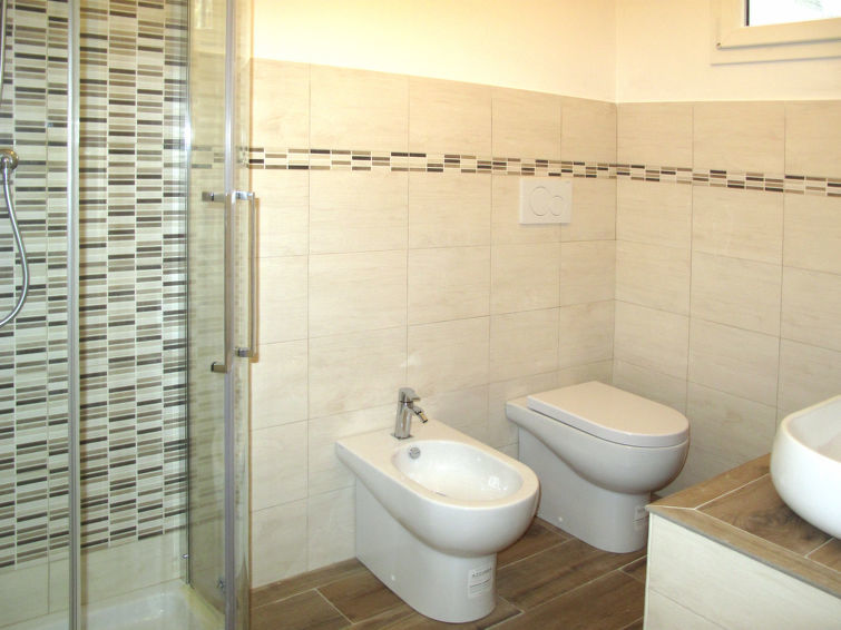 3-Zimmer-Wohnung, Erdgeschoss, ca. 53 m². Separater Zugang. Wohn-/Schlafraum mit Doppelbettcouch (1,60 m breit), Essplatz und Küchenzeile (4 Flammen, Backofen, Mikrowelle, Geschirrspüler, Kühl-/Gefrierkombination, Kaffeemaschine, Wasserkocher, Toaster), Terrassenausgang. Doppelzimmer (Bett 1,60 m breit) mit Terrassenausgang. Schlafzimmer mit Einzel- und Ausziehbett. Dusche/Bidet/WC. CITRA: 008054-LT-0009