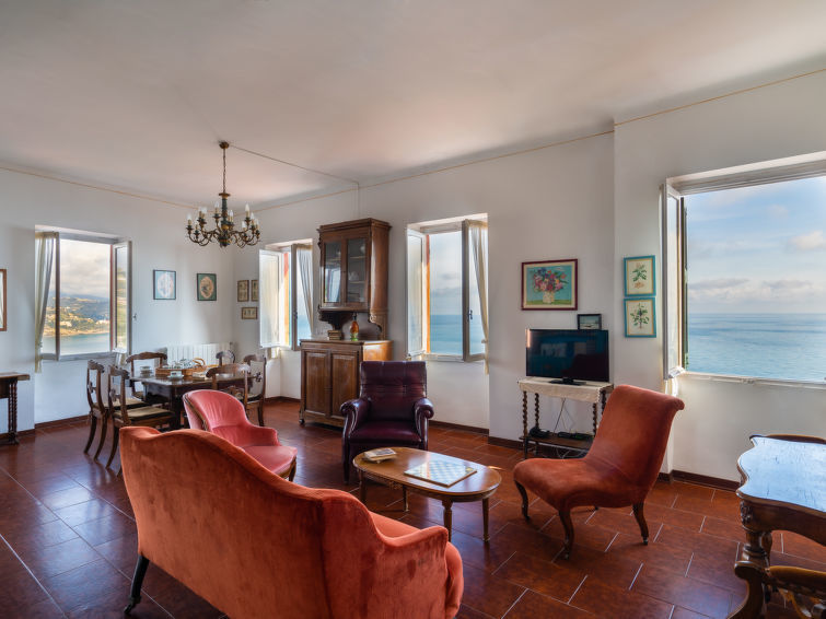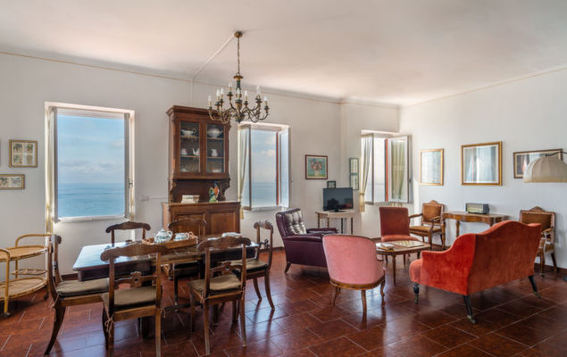 "Il Pangolo (VMA280)", 5-Zimmer-Wohnung 130 m2 im 2. Stock. Geräumig, einfach und antik eingerichtet: Wohn-/Esszimmer mit TV. 1 Zimmer mit 1 Doppelbett (140 cm). Ausgang zum Balkon. 1 Zimmer mit 2 Betten (80 cm). Ausgang zum Balkon. 2 Zimmer, jedes Zimmer mit 1 Bett (80 cm). Küche (Backofen, Geschirrspüler, 5 Flammen, Toaster, Wasserkocher, Mikrowelle, Tiefkühler, elektrische Kaffeemaschine) mit kleinem Esstisch. Bad/Bidet/WC, Dusche/Bidet/WC. G-Heizung. Balkon, grosse Terrasse 100 m2. Balkonmöbel, Gartengrill (mobil), Liegestühle (2), Abstellkammer. Sehr schöne Sicht auf das Meer und die Bucht. Zur Verfügung: Waschmaschine, Kinderhochstuhl, Babybett. Internet (Wireless LAN, gratis). Maximal 2 Haustiere/Hunde erlaubt. CITRA: 008065-LT-0012
