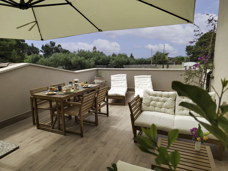 Mehrfamilienhaus, Baujahr 2023. Im Weiler San Corrado, 6 km vom Zentrum von Noto, 37 km vom Zentrum von Siracusa, ruhige, sonnige Lage, 15 km vom Meer. Zur Mitbenutzung: Grundstück 2'000 m2 (eingezäunt). Heizung vor Ort zu zahlen (01.Apr. - 14.Nov.), Heizung nur verfügbar von 15.Nov. - 31.Mar.. Koch möglich (extra). Frühstück auf Anfrage (extra). Treppenweg (18 Stufen) bis zum Haus. Parkplatz auf dem Grundstück. Supermarkt 2 km, Restaurant 2 km, Bar 2 km, Bushaltestelle 6.5 km, Bahnstation "Noto" 8.5 km, Sandstrand "Lido di Noto" 15 km. Nahe gelegene Sehenswürdigkeiten: Parco Archeologico Noto Antica 8 km, Avola 14 km, Marzamemi 25 km, Isola delle Correnti Punto Sud Sicilia 32 km, Modica 37 km, Ragusa 50 km. Bekannte Seen in der Umgebung sind gut erreichbar: Laghetto del Cassibile 13 km. Wandergebiete: Riserva Oasi Faunistica Vendicari 18 km. Bitte beachten: Fahrzeug empfohlen. Die Residenz wird durch elektrische Tore geschlossen. Der Besitzer wohnt im selben Haus. Eigentümer hat einen Hund.