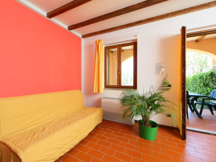 2-Zimmer-Wohnung 45 m2, im Erdgeschoss. Hell, einfach und komfortabel eingerichtet: Wohnzimmer mit 1 Doppeldiwanbett und Sat-TV. 1 Doppelzimmer. Kochnische (4 Kochplatten, Geschirrspüler) mit Esstisch. Dusche/Bidet/WC. Klimaanlage. Garten. Zur Verfügung: Haartrockner. 1 Haustier/Hund erlaubt.