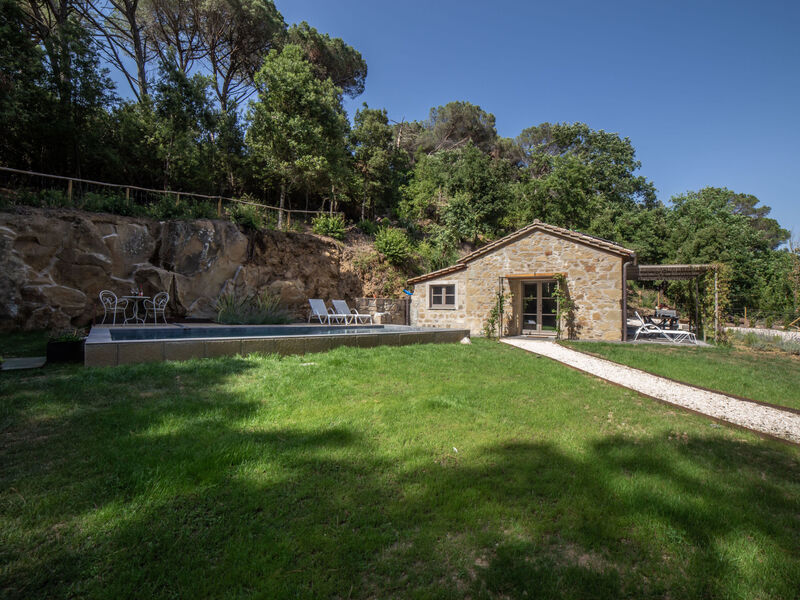 Modernes, freistehendes, luxuriöses Chalet "Il Talamo", umgeben von Bäumen. 7 km vom Zentrum von Passignano Sul Trasimeno, 1 km vom Zentrum von Castel Rigone, auf einem Hügel, 6 km vom See. Zur Alleinbenutzung: Grundstück 1 ha, Garten 2'000 m2 (eingezäunt), Schwimmbad (8 x 3 m, 130 cm tief, saisonale Verfügbarkeit: 01.Mai. - 30.Okt.). Sitzplatz, Gartenmöbel, Grill. Wäschewechsel 1 mal wöchentlich. Handtuchwechsel 1 mal wöchentlich. Wohnungsreinigung 1 mal wöchentlich. Einkaufsservice vor Anreise möglich. Zufahrt (20 m Naturweg). Parkplatz auf dem Grundstück. Lebensmittelgeschäft 7 km, Supermarkt 7 km, Restaurant 1 km, Bushaltestelle 80 m, Fähre "Isole Del Trasimeno" 13 km, Grasstrand 7 km. Nahe gelegene Sehenswürdigkeiten: San Feliciano 11 km, Tuoro Sul Trasimeno 13 km, Castiglione Del Lago 25 m, Cortona 30 km, Perugia 40 km, Assisi 50 km. Bitte beachten: Fahrzeug empfohlen.