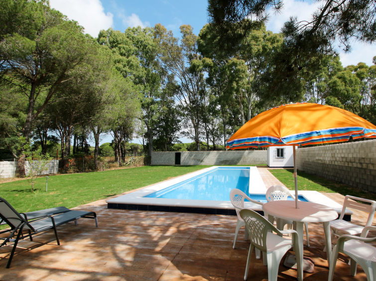 Bungalow "Miraalba". 6 km vom Zentrum von Chiclana de la Frontera, 15 km vom Zentrum von Conil de la Frontera, 32 km vom Zentrum von Cádiz, 7 km vom Meer, 7 km vom Strand. Zur Alleinbenutzung: Grundstück 2'200 m2 (eingezäunt), Garten mit Pflanzen und Bäumen, Schwimmbad (17 x 4 m, 110 - 180 cm tief, 01.01.-31.12.). Aussendusche, Terrasse, Gartenmöbel, Grill, Parkplatz (für 2 Autos) auf dem Grundstück. Einkaufsgeschäft 2 km, Supermarkt 3 km. Golfplatz (18 Loch) 5 km. Bitte beachten: Fahrzeug empfohlen.