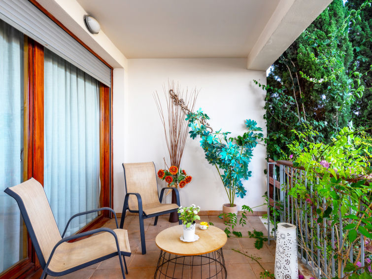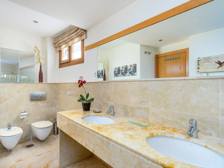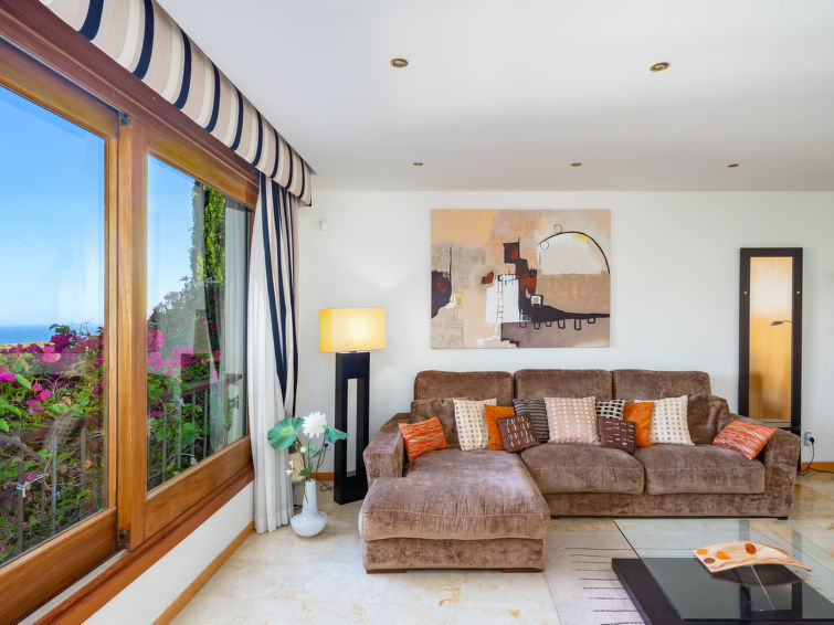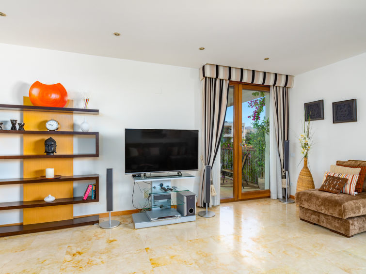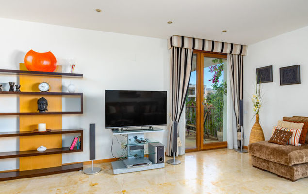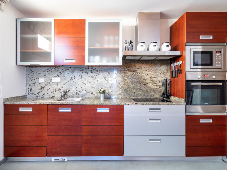 4-Zimmer-Wohnung 140 m2, im Erdgeschoss. Geräumig und hell, modern und luxuriös eingerichtet: Eingang. Grosses Wohn-/Esszimmer mit Esstisch, Digital-TV, Internationale TV-Sender, CD und DVD. Ausgang zur Terrasse. 2 Zimmer, jedes Zimmer mit 2 Betten (90 cm, Länge 200 cm). Ausgang zur Terrasse. 1 Zimmer mit begehbarer Kleiderschrank mit 1 franz. Bett (150 cm, Länge 200 cm), Bad/Bidet/WC und Doppelwaschbecken. Ausgang zur Terrasse. Küche (Backofen, Geschirrspüler, 4 Glaskeramikherd Platten, Toaster, Wasserkocher, Mikrowelle, Tiefkühler, elektrische Kaffeemaschine) mit Esstisch. Bad/Bidet/WC, sep. WC. Klimaanlage, Warmluftheizung. Terrasse 20 m2, überdacht. Terrassenmöbel. Seitliche Sicht auf das Meer und die Berge. Zur Verfügung: Waschmaschine, Bügeleisen, Kinderhochstuhl, Babybett, Haartrockner. Internet (Wireless LAN, gratis). Parkplatz. VFT/MA/53397