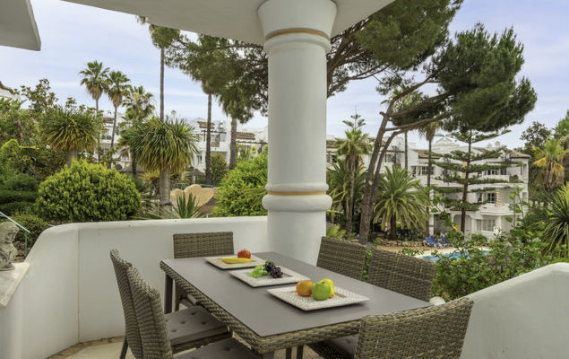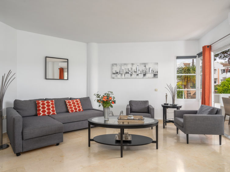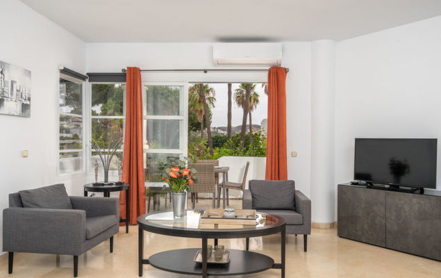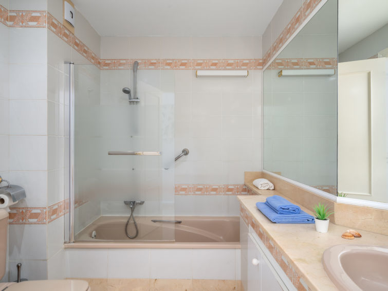 "Golf & Sun Pool view", 3-Zimmer-Wohnung 77 m2, im Erdgeschoss. Zweckmässig und schön eingerichtet: Wohn-/Esszimmer mit Digital-TV. Ausgang zur Terrasse, zum Schwimmbad. 1 Zimmer mit 1 franz. Bett (160 cm, Länge 190 cm). 1 Zimmer mit 2 Betten (90 cm, Länge 190 cm). Küche (Backofen, Geschirrspüler, 4 Glaskeramikherd Platten, Toaster, Wasserkocher, Mikrowelle, Tiefkühler, elektrische Kaffeemaschine). 2 Bäder/WC. Klimaanlage, Warmluftheizung. Terrasse 14 m2. Sicht auf das Schwimmbad und den Garten. Zur Verfügung: Waschmaschine, Bügeleisen, Kinderhochstuhl, Babybett, Haartrockner. Internet (Wireless LAN, gratis). VFT/MA/17612