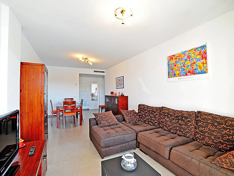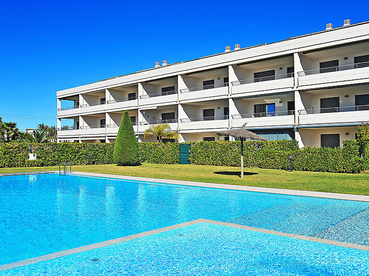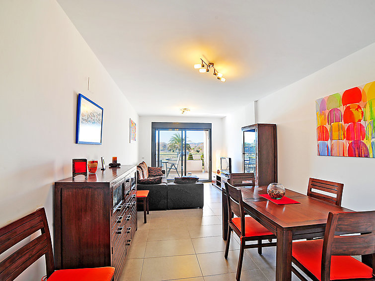 3-Zimmer-Wohnung 75 m2 im 1. Stock. Geräumig und hell, sehr komfortabel und geschmackvoll eingerichtet: Wohn-/Esszimmer mit Digital-TV und Klimaanlage. Ausgang zur Terrasse. 1 Zimmer mit 2 Betten und Klimaanlage. 1 Zimmer mit 1 franz. Bett (2 x 150 cm), Bad/Bidet/WC und Klimaanlage. Ausgang zur Terrasse. Küche (Backofen, Geschirrspüler, 4 Glaskeramikherd Platten, Mikrowelle, Tiefkühler, elektrische Kaffeemaschine). Dusche/WC. Grosse Terrasse 18 m2. Terrassenmöbel. Schöne Sicht auf das Schwimmbad. Zur Verfügung: Waschmaschine. Internet (Wireless LAN, gratis). Garage Nr. 24. Bitte beachten: Nichtraucher-Unterkunft. TV nur ES. AT446962