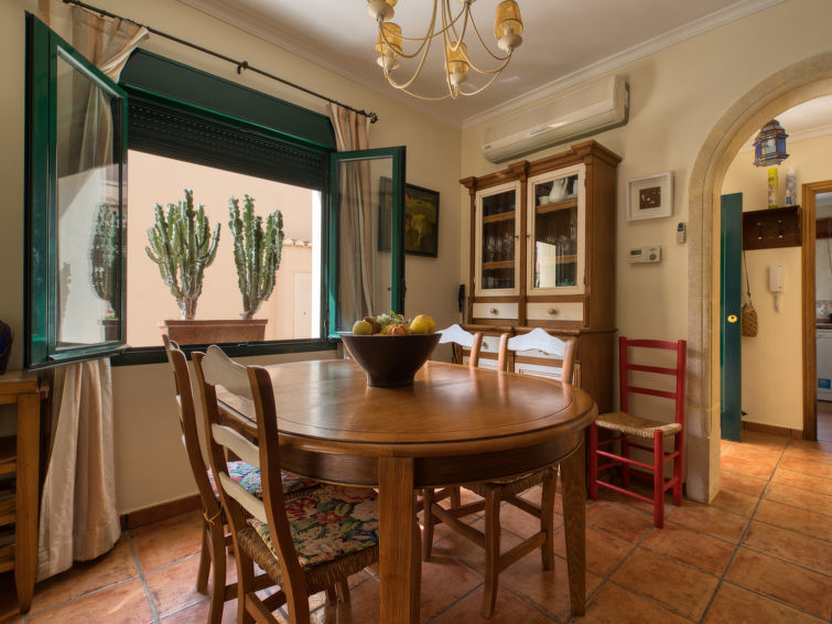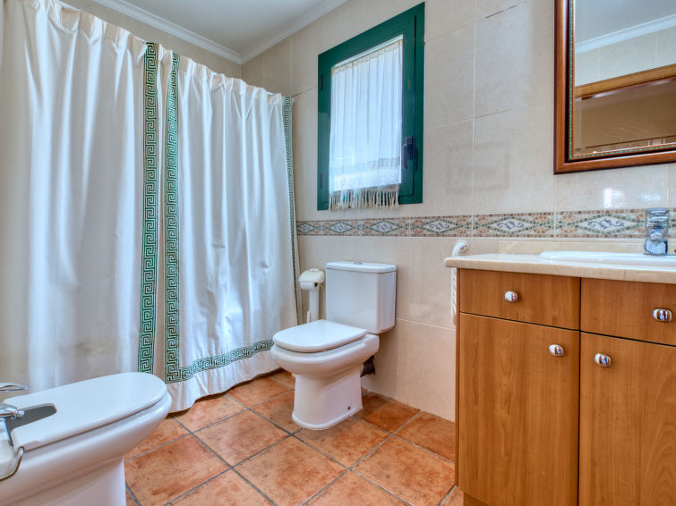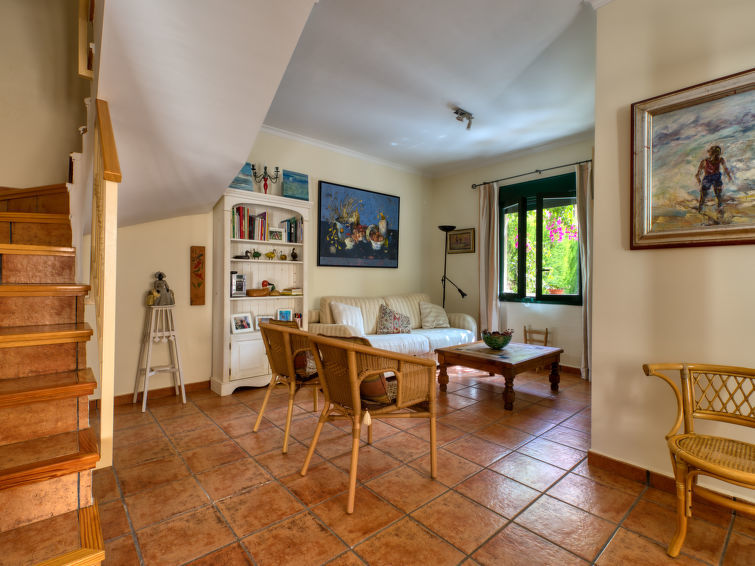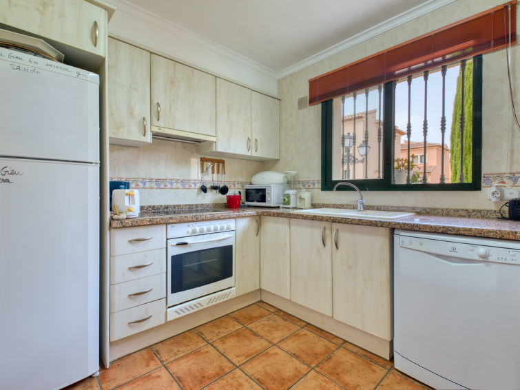 "Jardines del Mar", 4-Zimmer-Reihenhaus 125 m2 auf 2 Stockwerken. Komfortabel und gemütlich eingerichtet: Wohn-/Esszimmer mit Digital-TV, Klimaanlage und Warmluftheizung. Ausgang zum Gartensitzplatz. 1 Zimmer mit 2 Betten (90 cm, Länge 180 cm), Ventilator. Küche (Geschirrspüler, 4 Glaskeramikherd Platten, Mikrowelle, Tiefkühler, elektrische Kaffeemaschine). Dusche/WC. Obergeschoss: 1 Zimmer mit 1 franz. Bett (150 cm, Länge 180 cm), Ventilator. Ausgang zum Balkon. 1 Zimmer mit 2 Betten (105 cm, Länge 190 cm), Ventilator. Ausgang zum Balkon. Bad/Bidet/WC. Zur Verfügung: Bügeleisen, Haartrockner. Garage Nr. 51. Bitte beachten: TV nur ES. VT-487023-A