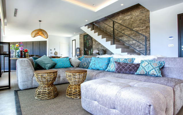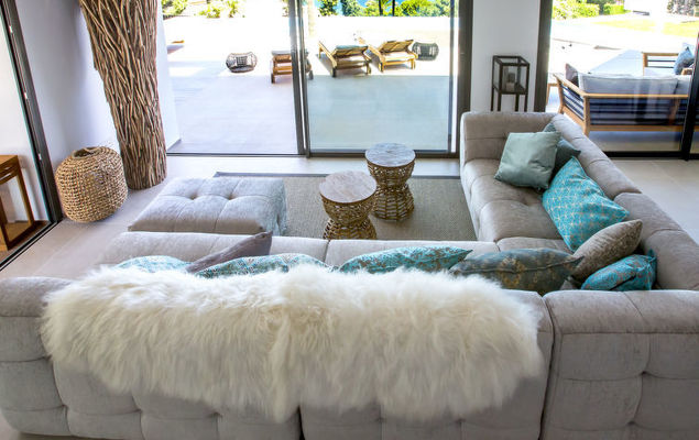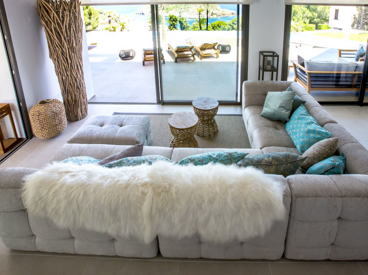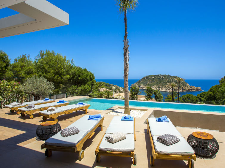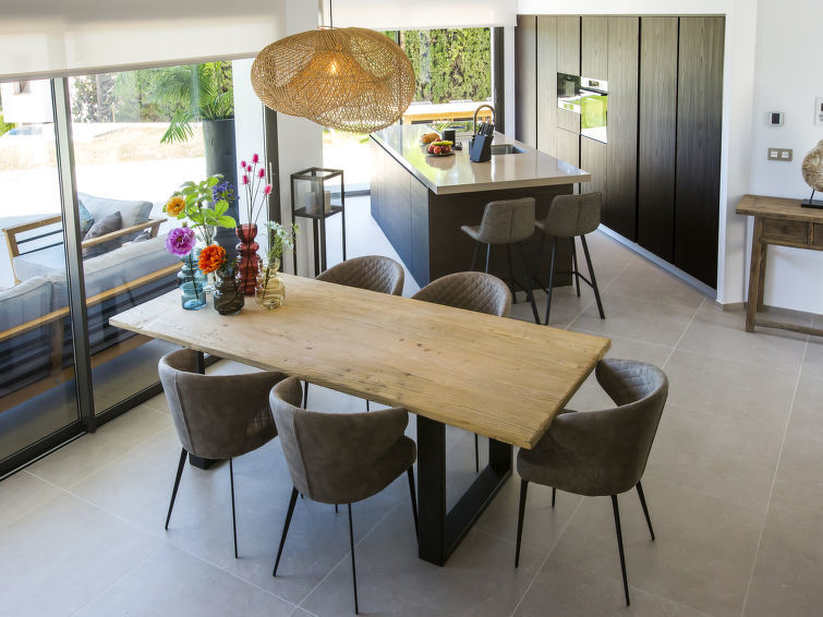 "El Refugio", 5-Zimmer-Villa 450 m2 auf 2 Stockwerken. Geräumig und hell, sehr modern und stilvoll eingerichtet: Wohn-/Esszimmer mit Sat-TV, Digital-TV, Klimaanlage und Warmluftheizung. Ausgang zur Terrasse, Pergola, zum Schwimmbad. Grosse, offene Küche (Backofen, Geschirrspüler, 4 Induktionskochplatten, Toaster, Wasserkocher, Mikrowelle, Tiefkühler, elektrische Kaffeemaschine) mit Klimaanlage und Warmluftheizung. Ausgang zum Gartensitzplatz, zum Schwimmbad. Sep. WC. Unteres Geschoss: 1 Zimmer mit 1 franz. Bett (2 x 90 cm, Länge 200 cm), Dusche/WC, Doppelwaschbecken, Klimaanlage und Warmluftheizung. Ausgang zur Terrasse. 1 Zimmer mit 1 franz. Bett (2 x 90 cm, Länge 200 cm), Dusche/WC, Klimaanlage und Warmluftheizung. Ausgang zur Terrasse. 1 Zimmer mit 1 franz. Bett (2 x 90 cm, Länge 200 cm), Klimaanlage und Warmluftheizung. Ausgang zur Terrasse. 1 Zimmer mit 1 franz. Bett (2 x 90 cm, Länge 200 cm), Klimaanlage und Warmluftheizung. Ausgang zur Terrasse. Dusche/WC, Doppelwaschbecken. Grosser Gartensitzplatz, Rasen. Terrassenmöbel, Gartengrill, Liegestühle, Loggia, Sitzplatz. Herrliche Panoramasicht auf das Meer. Zur Verfügung: Waschmaschine, Wäschetrockner, Bügeleisen, Fliegengitter, Kinderhochstuhl, Babybett, Haartrockner. Internet (Wireless LAN, gratis). VT487546A